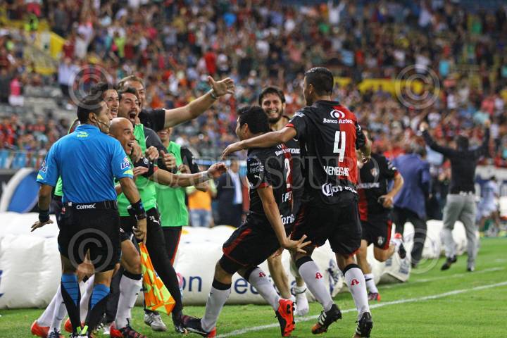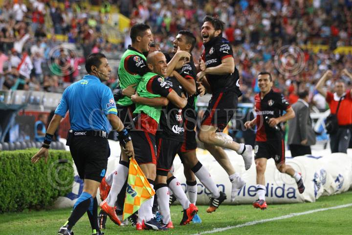 GUADALAJARA, JALISCO. 25ABRIL2015.- Jugadores del Atlas celebran la anotación que les da el triunfo, esto en partido correspondiente a la Jornada 15 del Torneo Clausura 2015 de la Liga MX, en donde se enfrentaron los equipos del Atlas frente a León en partido que se celebra en el Estadio Jalisco. FOTO: FERNANDO CARRANZA GARCIA / CUARTOSCURO.COM