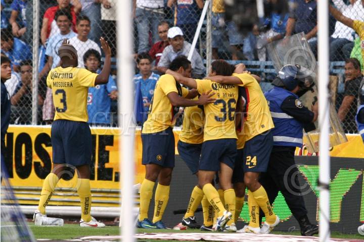 MÉXICO, D.F., 22AGOSTO2009.- Daniel Omar Marquez de las Aguilas del Ámerica festeja su anotación en contra de la Maquina Celeste del Cruz Azul, luego de que derrotaran 3 - 2 a los celestres en partido de la jornada 5 del torneo Apertura 2009. FOTO: RODOLFO ANGULO/CUARTOSCURO.COM