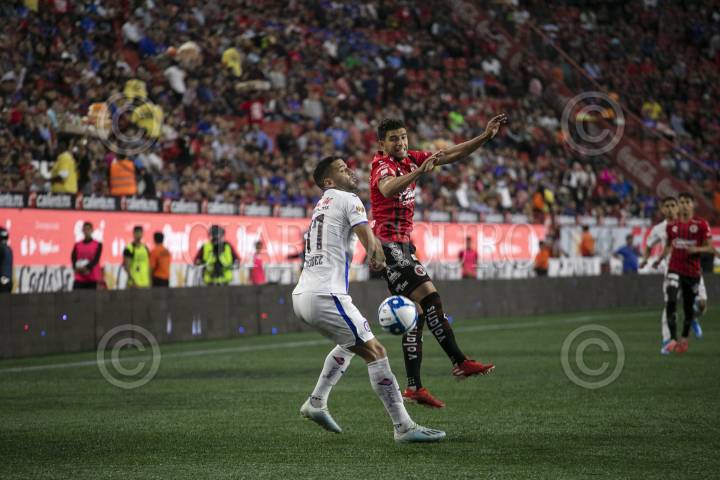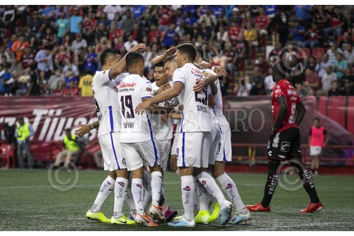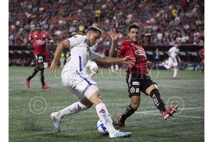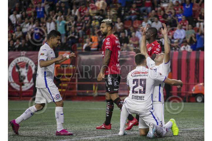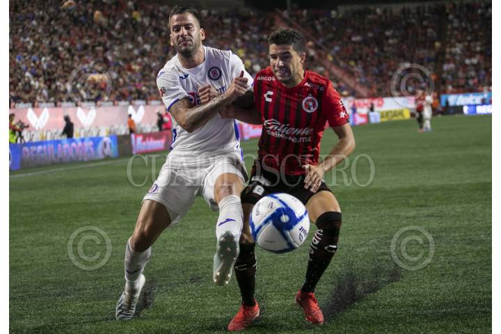 TIJUANA, BAJA CALIFORNIA, 28AGOSTO2019.- Edgar Méndez disputa el balón con José Rivero, durante el partido entre Xoloitzcuintles de Tijuana contra Cruz Azul, en partido realizado en el estadio Caliente, como parte de la Jornada 07 del Torneo de Apertura 2019 de la Liga MX. Marcador final: Xolos 3, Cementeros 2. FOTO: OMAR MARTÍNEZ /CUARTOSCURO.COM