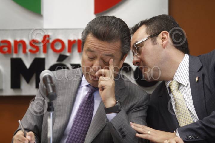 MÉXICO, DF., 06FEBRERO2014.- César Camacho, líder del PRI y Guillermo Deloya, director del Instituto de Capacitación y Desarrollo Político durante el lanzamiento de los llamados Círculos de Debate. Estos tienen el objetivo de buscar nuevos talentos para el partido entre los jóvenes, subraya el presidente del tricolor, que su partido está buscando no sólo ganar elecciones, sino también los debates. FOTO: MOISES PABLO /CUARTOSCURO.COM