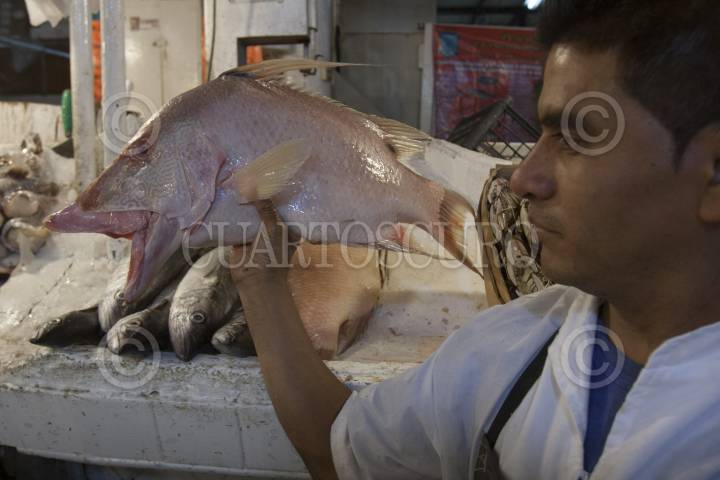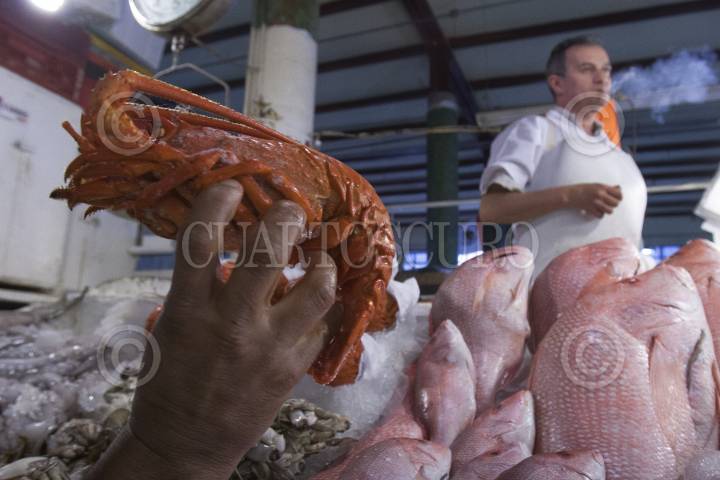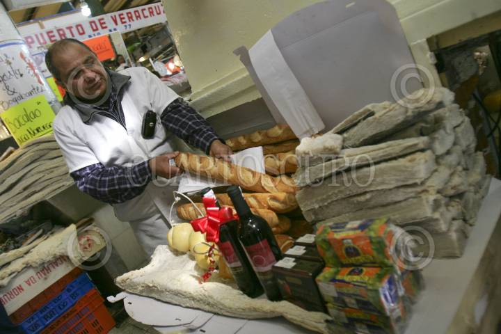 MÉXICO, D.F., 30DICIEMBRE2012.- Locatarios del mercado de San Juan muestran los productos que las personas más compran para hacer la cena de Año Nuevo. Los productos van desde el bacalao, mariscos, lechones, langosta, cabrito, hasta jabalí y venado, sin olvidar las uvas y el pavo. FOTO: JUAN PABLO ZAMORA /CUARTOSCURO.COM