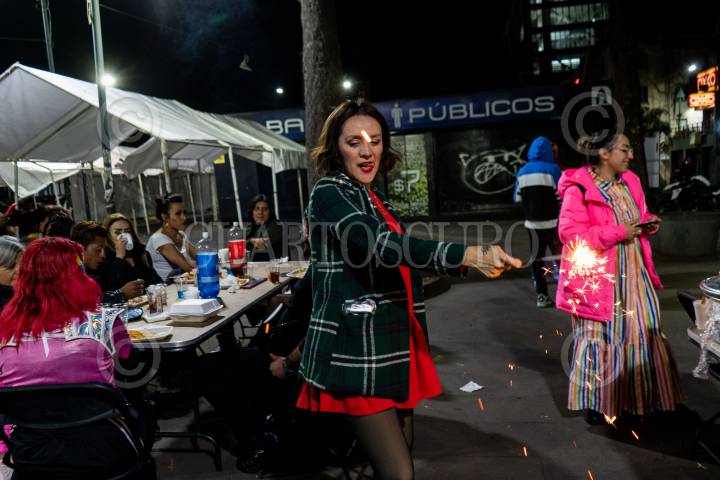 CIUDAD DE MÉXICO, 25DICIEMBRE2024.- Durante la Nochebuena integrantes y voluntariado de la Organización “Lleca Escuchando la Calle”, para mujeres y personas LGBT+, realizaron su tradicional iniciativa “Navitrans” en la que regalaron cenas navideñas, ponche y rompieron piñatas para celebrar con las, los y les integrantes de la población trans, trabajadoras sexuales y personas en situación vulnerable que se encuentran en las inmediaciones del metro Revolución y alrededores. Desde 2020 la activista Victoria Samano, fundadora y directora de Casa Lleca, ha realizado esta labor solidaria gracias a la ayuda de donaciones tanto en especie como económicas. Casa Lleca es un espacio en que la población LGBT+ puede acudir en caso de encontrarse en una situación de riesgo y actualmente operan también como un comedor comunitario para dar alimentación a personas en situaciones vulnerables FOTO: GALO CAÑAS/CUARTOSCURO.COM