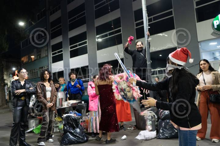 CIUDAD DE MÉXICO, 25DICIEMBRE2024.- Durante la Nochebuena integrantes y voluntariado de la Organización “Lleca Escuchando la Calle”, para mujeres y personas LGBT+, realizaron su tradicional iniciativa “Navitrans” en la que regalaron cenas navideñas, ponche y rompieron piñatas para celebrar con las, los y les integrantes de la población trans, trabajadoras sexuales y personas en situación vulnerable que se encuentran en las inmediaciones del metro Revolución y alrededores. Desde 2020 la activista Victoria Samano, fundadora y directora de Casa Lleca, ha realizado esta labor solidaria gracias a la ayuda de donaciones tanto en especie como económicas. Casa Lleca es un espacio en que la población LGBT+ puede acudir en caso de encontrarse en una situación de riesgo y actualmente operan también como un comedor comunitario para dar alimentación a personas en situaciones vulnerables. FOTO: GALO CAÑAS/CUARTOSCURO.COM
