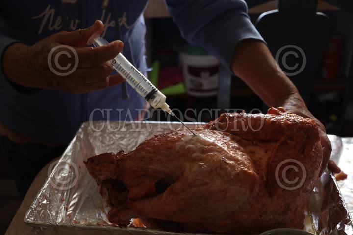 CIUDAD DE MÉXICO, 24DICIEMBRE2023.- Aspectos de la preparación de una cena navideña. Un pavo es inyectado con leche antes de ser cocinado en el horno. FOTO: EDGAR NEGRETE LIRA/CUARTOSCURO.COM