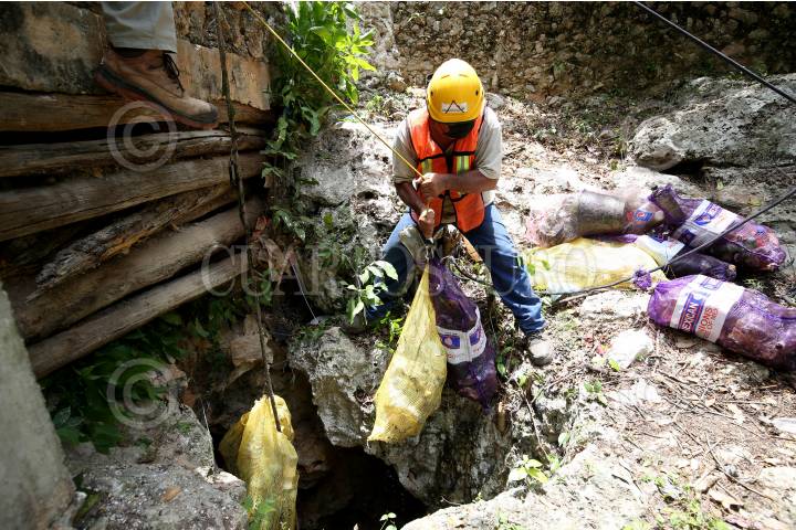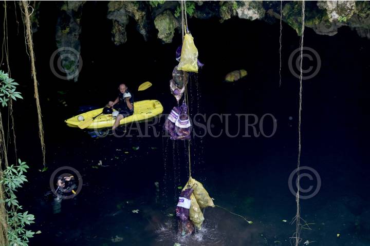 Un grupo de buzos, encabezado por el arqueólogo Sergio Grosjean, limpiaron el cenote de la comunidad X-Catzín, ubicado en el poblado de Chemax.