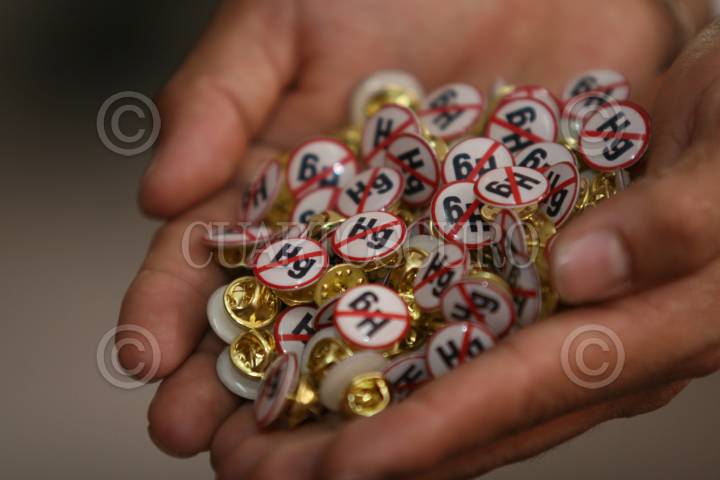 MÉXICO D.F. 30JUNIO2008.-Se realizó la Conferencia Internacional sobre la Sustitución y Reducción del Uso de Mercurio en Hospitales. En la imagen un enfermero muestra botones con el símbolo del Mercurio censurado. FOTO: GUILLERMO PEREA/CUARTOSCURO.COM