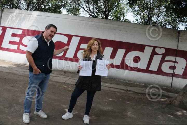 Una persona pasa caminando a un costado de la barda pintada con la leyenda "#EsClaudia".