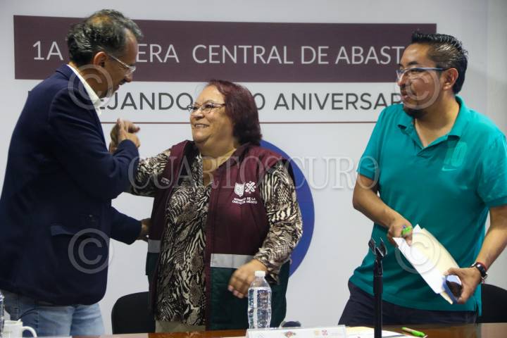 Martí Batres, jefe de Gobierno, dialoga con Clara Brugada, alcaldesa de Iztapalapa, al evento también asistió Marcela Villegas, directora de la Central de Abasto.