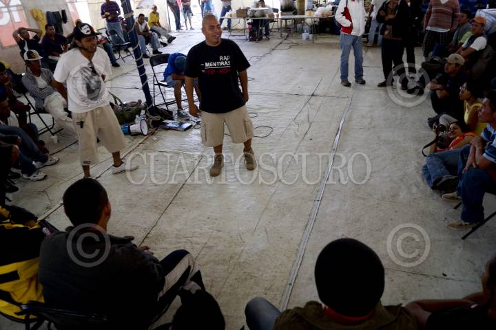TULTITLAN, ESTADO DE MÉXICO, 30JULIO2012.- Una agrupación de Rap "Underground" visitó esta tarde a los y las migrantes de Honduras, el Salvador y Guatemala que descansan en un albergue en espera del tren que les permitirá continuar con su viaje a la frontera norte. El albergue está ubicado debajo de un puente en la Avenida Independencia de este municipio. FOTO: PEDRO ANZA /CUARTOSCURO.COM