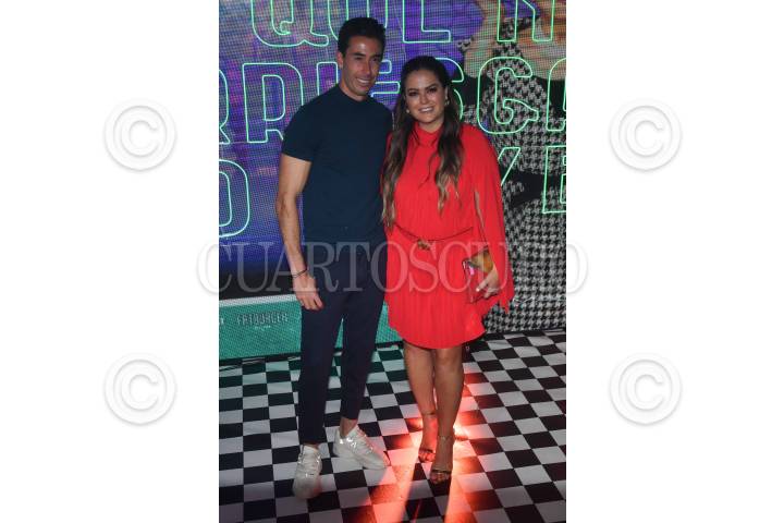 Mariana Echeverría, junto a su pareja Óscar Jiménez, durante la alfombra del musical "Vaselina" en el Centro Cultural Teatro 1.