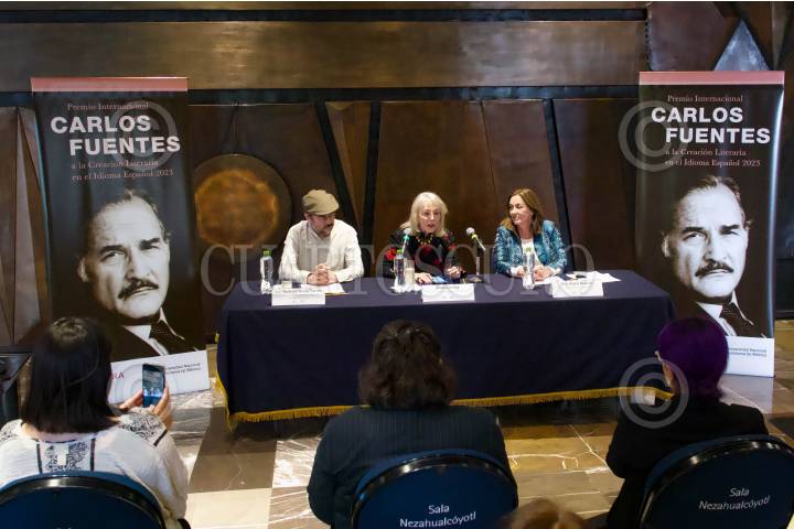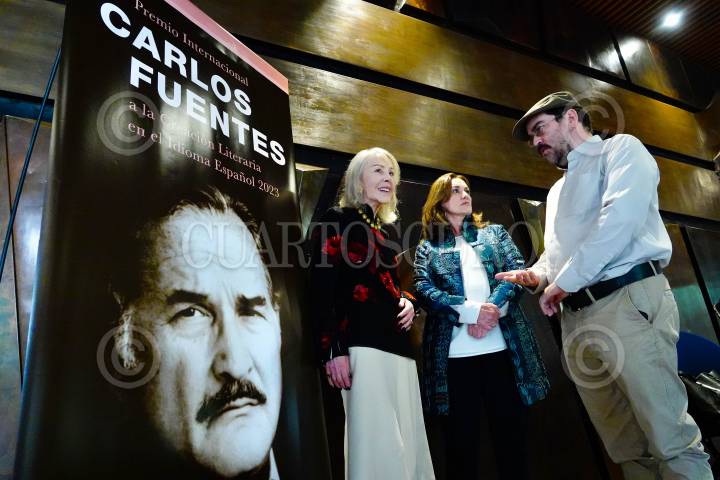 Rodrigo Borja, Silvia Lemus y Rosa Beltran, durante la conferencia de prensa del Premio Internacional Carlos Fuentes a la Creación Literaria en el Idioma Español 2023.