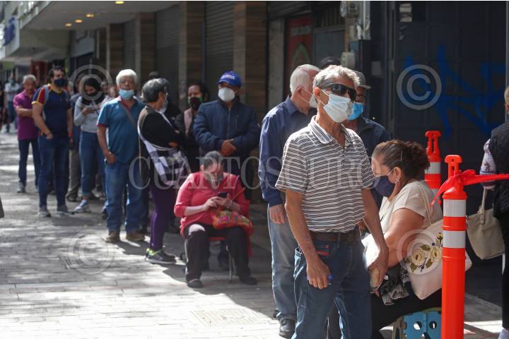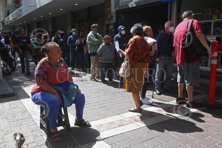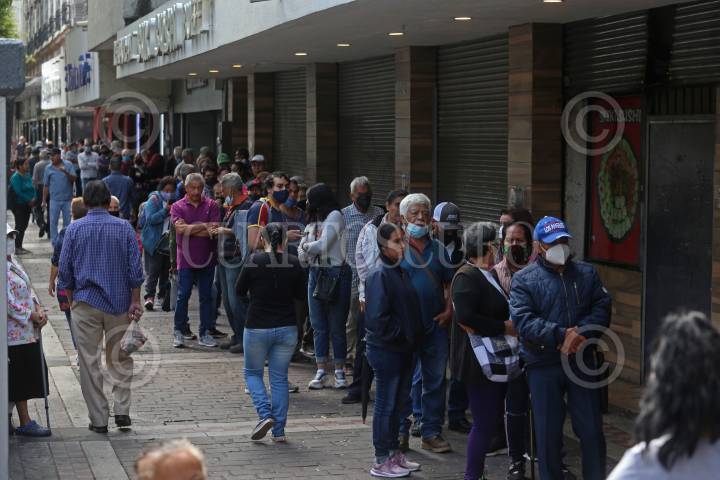 Personas de la tercera con tarjeta del bienestar, hacen fila para tratar de cobrar su Pensión para el Bienestar, que otorga el Gobierno Federal.