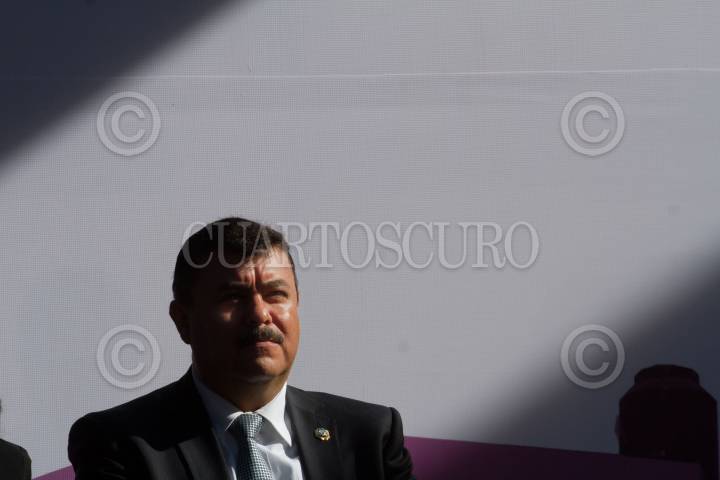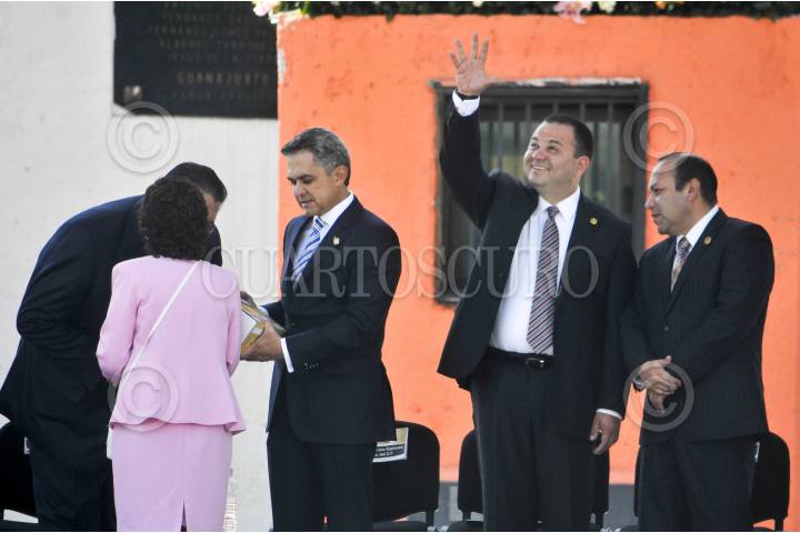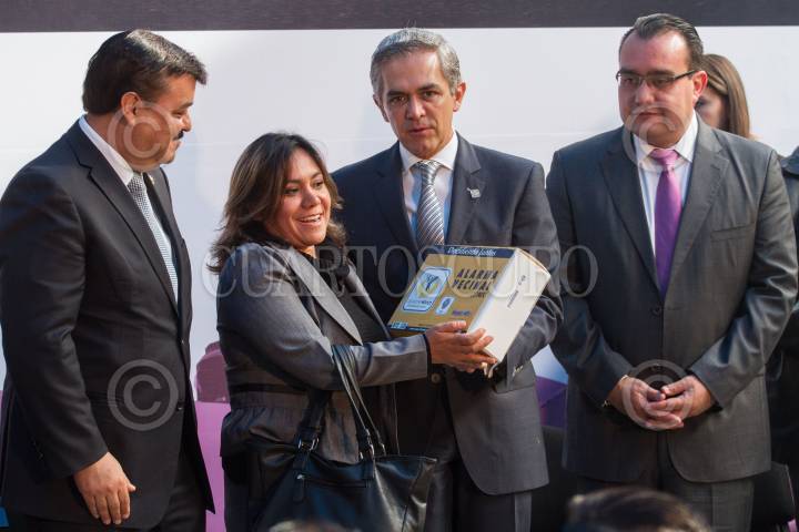 MÉXICO, D.F., 24FEBRERO2014.- Miguel Ángel Mancera, jefe de gobierno capitalino; José Manuel Ballesteros, jefe de la delegación Venustiano Carranza; Jesús Rodriguez Almeida, secretario de Seguridad Pública y el diputado Julio César Moreno, durante el evento de entrega de 2000 alarmas vecinales y el banderazo de salida de 37 nuevas patrullas. FOTO: DIEGO SIMÓN SÁNCHEZ /CUARTOSCURO.COM