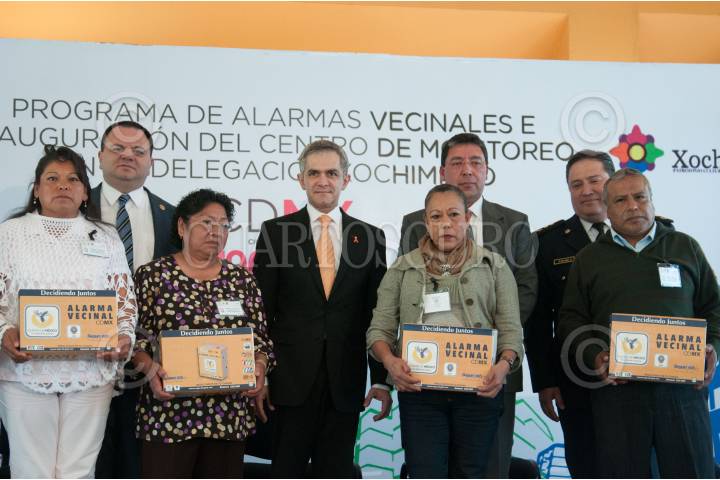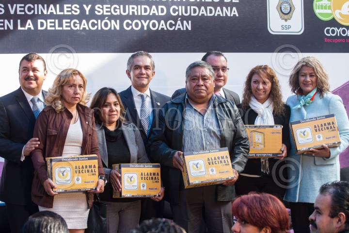 MEXICO, D.F., 17FEBRERO2015.- Hiram Almeida Estrada, titular de la Secretaría de Seguridad Pública local, Miguel Ángel Mancera, jefe de Gobierno del D.F., y Salvador Frausto Navarro, encargado de Despacho de la Jefatura Delegacional de Coyoacán, entregaron alarmas vecinales a colonos de la demarcación, en el marco de la inauguración del Centro de Monitoreo de Alarmas Vecinales y Seguridad Ciudadana. FOTO: ISAAC ESQUIVEL /CUARTOSCURO.COM