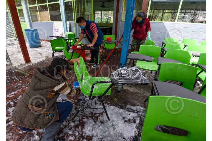 Padres de familia realizan limpieza de escuelas mexiquenses que albergarán Casillas electorales el próximo 6 de junio, para garantizar un espacio limpio durante el proceso electoral.