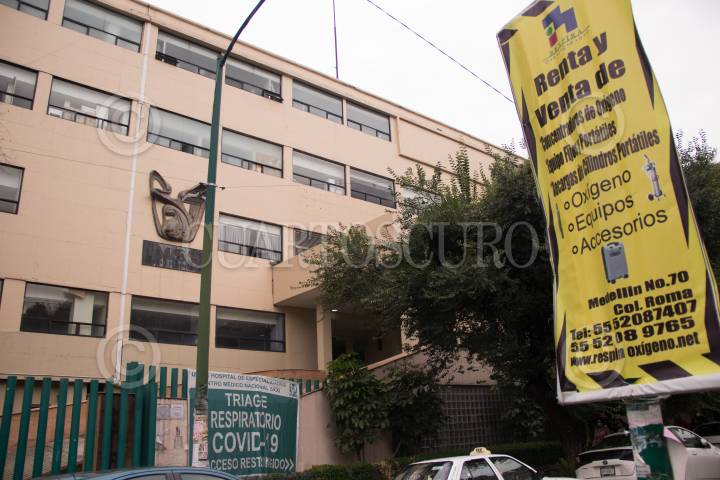 Una camilla con un tanque de oxígeno se observan en la puerta del área de Covid-19 del Hospital General de México, momentos antes paramédicos ingresaron a una paciente de la tercera edad.