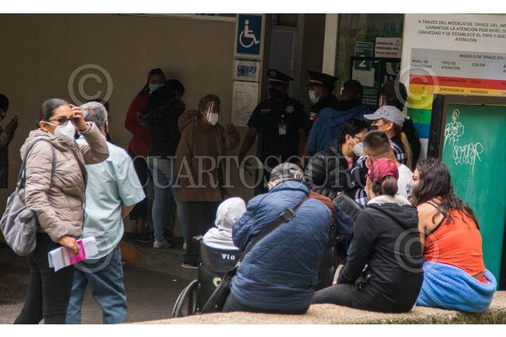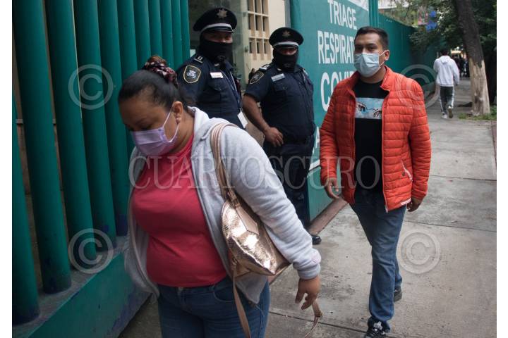 Dos hombres esperan afuera del Triage del Hospital General, noticias de su enfermo por Covid-19.