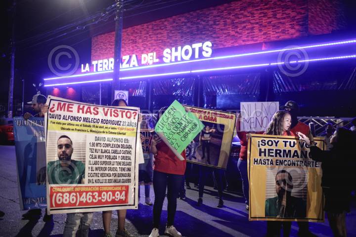 Ante la creciente cantidad de secuestros en el llamado 'triángulo de las bermudas', familias afectadas y comunidad se manifiestan en el Bar SHOTS de Mexicali, en donde el pasado 8 de abril desaparecieron 3 hombres