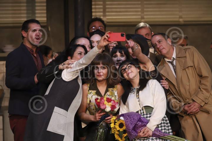 Marco de la O, Itatí Cantoral y Marcial Cásale se toman una foto junto a parte del equipo de producción al finalizar la función de estreno de la obra “Sola en la oscuridad” en el Teatro México.