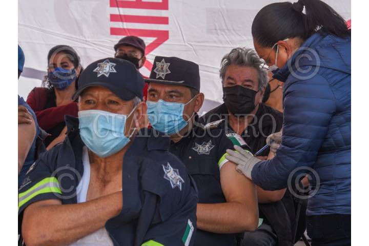 Dos policías estatales acudieron a recibir su refuerzo de la vacuna contra COVID-19 en el segmento de Adultos de 50 a 59 años de edad.