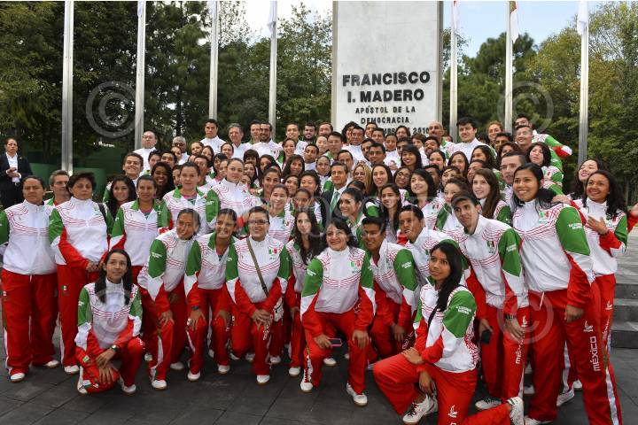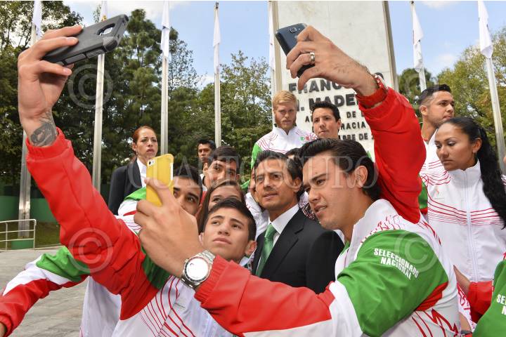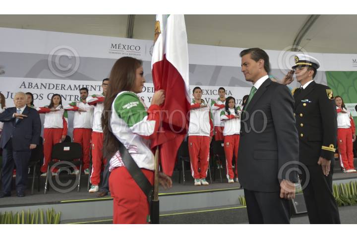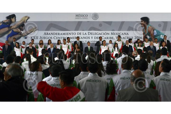 MÉXICO, D.F., 31OCTUBRE2014.- El Presidente de la República, Enrique Peña Nieto, al encabezar el Abanderamiento de Delegación Mexicana que participará en los 22 Juegos Centroamericanos y del Caribe, Veracruz 2014, convocó a los deportistas a portar con orgullo y con dignidad los colores patrios. “Compitan con inteligencia, pero lo más importante, con pasión y con todo el corazón. Tengan siempre presente que cada victoria que obtengan será un triunfo para ustedes, un gran orgullo para sus familias y para todo México”. Indicó. La raquetbolista Paola Longoria fue la encargada de recibir la bandera nacional. FOTO: PRESIDENCIA /CUARTOSCURO.COM