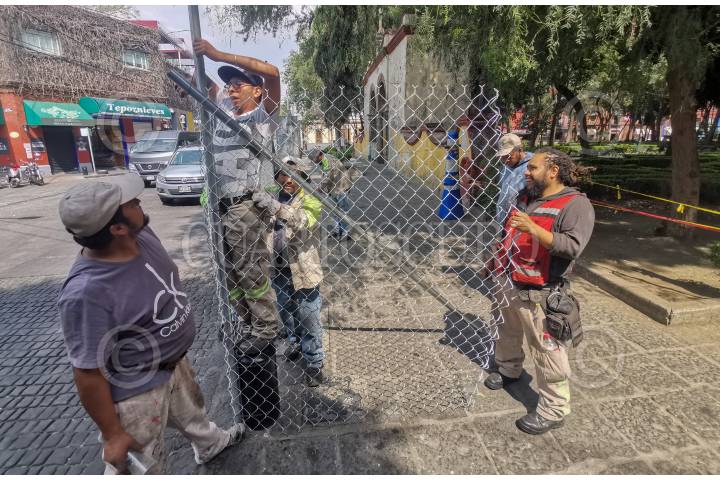 Los jardínes del centro de Coyoacán fueron roedeados por una malla de acera para evitar aglomeraciones de personas en estos días en donde se realizan los festejos del Día de Muertos.