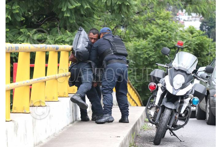 CUERNAVACA, MORELOS, 22JULIO2024.- Secuencia fotográfica de la detención de un sujeto en la ciudad de Cuernavaca. El hombre se encontraba en la vía publica observando desde lejos la escena de un crimen, sin embargo al negarse a retirarse del sitio, dos policías lo sometieron a la fuerza, esposándolo y remitiéndolo a los separos por alterar el orden. El sujeto en ningún momento trasgredió ningún cerco policiaco, solo miraba desde un puente peatonal. FOTO: MARGARITO PÉREZ RETANA/CUARTOSCURO.COM