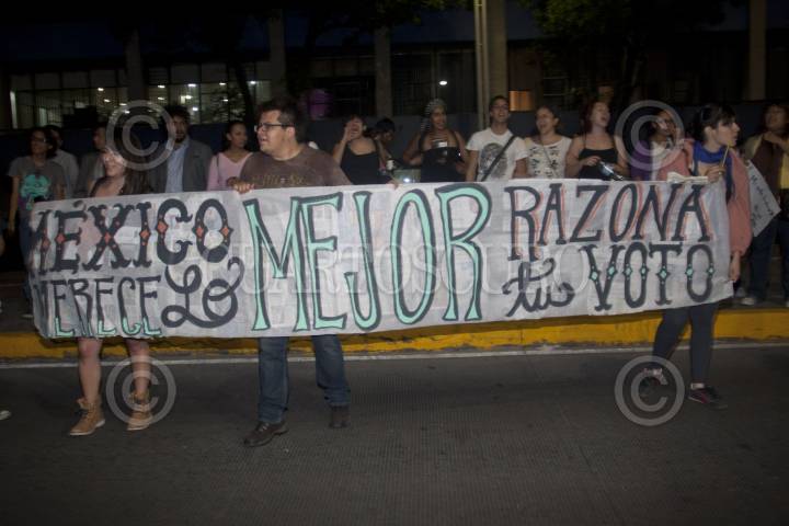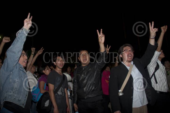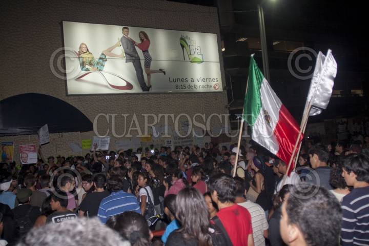 MÉXICO, D.F., 23MAYO2012.- Decenas de estudiantes del movimiento #132 se apostaron en las inmediaciones de Televisa Chapultepec para protestar por la inequidad informativa en el marco de las elecciones presidenciales de este año. Además trataban de impedir la entrada del Cadidato del PRI, Enrique Peña Nieto a las instalaciones de la televisora para asisitir a un programa de análisis político que se realizaría en vivo. FOTO: FRANCISCO RODRÍGUEZ /CUARTOSCURO.COM