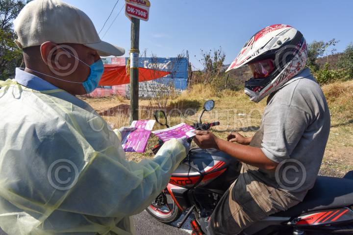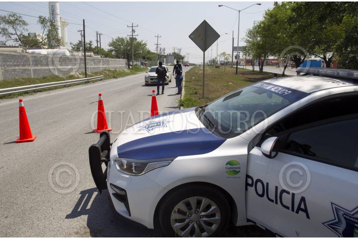 CADEREYTA, JIMÉNEZ, NUEVO LEÓN, 28MARZO2020.- Policía local del municipio de Cadereyta, realizan un cerco sanitario aleatorio a automovilistas en la autopista Monterrey-Reynosa, para tomar la temperatura corporal y registrar datos de viaje reciente a Estados Unidos. Hasta el momento, Cadereyta no registra personas contagiadas de covid-19 a pesar de su cercanía al área metropolitana de Monterrey. FOTO: GABRIELA PÉREZ MONTIEL / CUARTOSCURO.COM