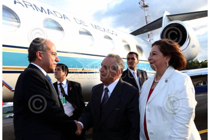 SAN JOSE, COSTA RICA, 07MAYO2010.- Felipe Calderón, Presidente de México, saluda a el embajador, director de protocolo y ceremonial de Costa Rica, Javier Sancho durante su llegada a el aeropuerto de la capital en el marco de la toma de posesión Laura Chinchilla Miranda como presidenta. FOTO: ARIEL GUTIERREZ/CUARTOSCURO.COM