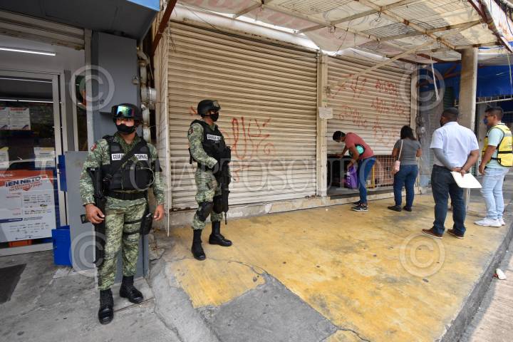 Personal de la COFEPRIS y de la Dirección de Gobernación municipal, resguardados por agentes de la Guardia Nacional y de la Policía Estatal, realizaron un recorrido por diversas calles del centro de la capital del estado para revisar que los negocios catalogados como "No esenciales" continúen cerrado