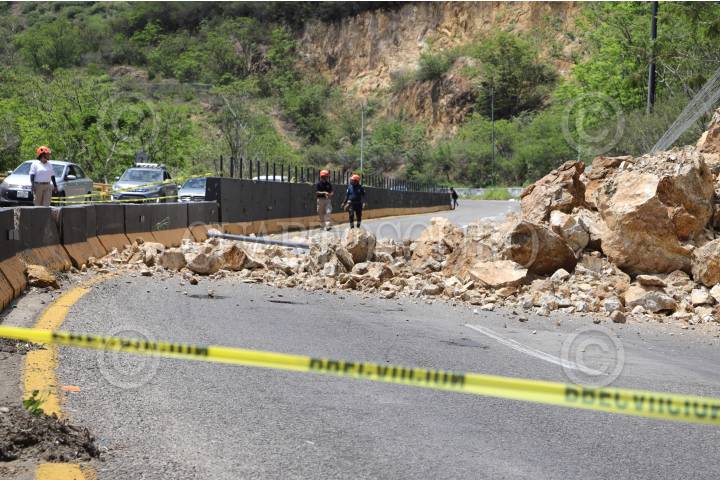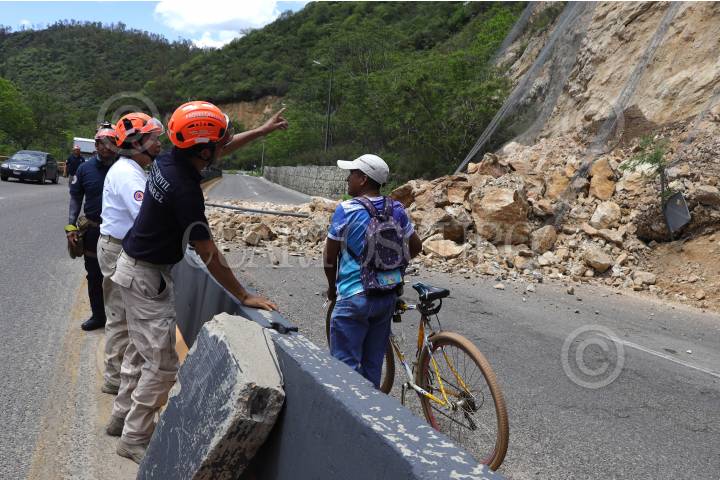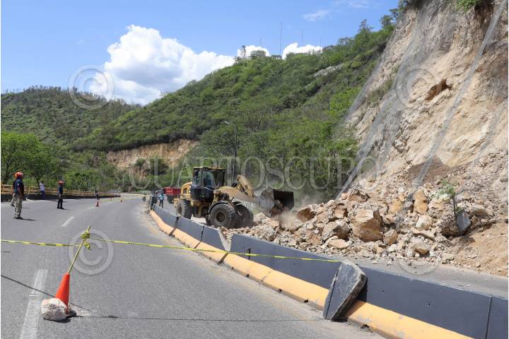 OAXACA, OAXACA, 26JUNIO2024.- Esté día ocurrió un derrumbe en la carretera al Cerro del Fortín, una de las principales vías que conecta el norte con el poniente de la ciudad de Oaxaca. Un carril fue cerrado en su totalidad por piedras que se desprendieron del cerro, lo que pudo ser producto de las lluvias que se han registrado en los últimos días. No hubo daños a vehículos o personas, la vialidad estuvo cerrada mientras se realizaron trabajos para remover el escombro. FOTO: CAROLINA JIMÉNEZ/CUARTOSCURO.COM