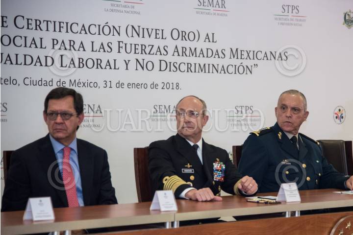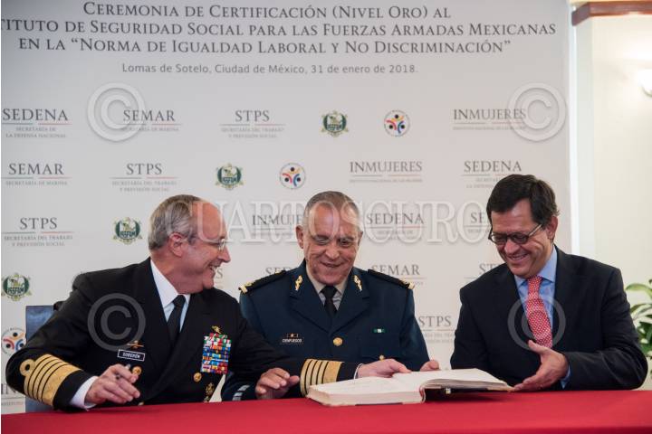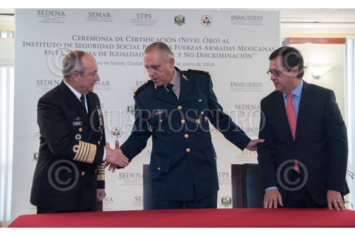 CIUDAD DE MÉXICO, 31ENERO2018.- Salvador Cienfuegos Zepeda, secretario de la Defensa Nacional, Vidal Soberón Sanz, secretario de Marina y Roberto Rafael Campa Cifrián, Secretario del Trabajo y Previsión Social (STPS), presidieron la “Ceremonia de la Certificación (Nivel Oro) al ISSFAM”, otorgado por el Consejo Interinstitucional Integrado por personal de la STPS, Instituto Nacional de las Mujeres y el Consejo Nacional para Prevenir la Discriminación. FOTO: MARIO JASSO /CUARTOSCURO.COM