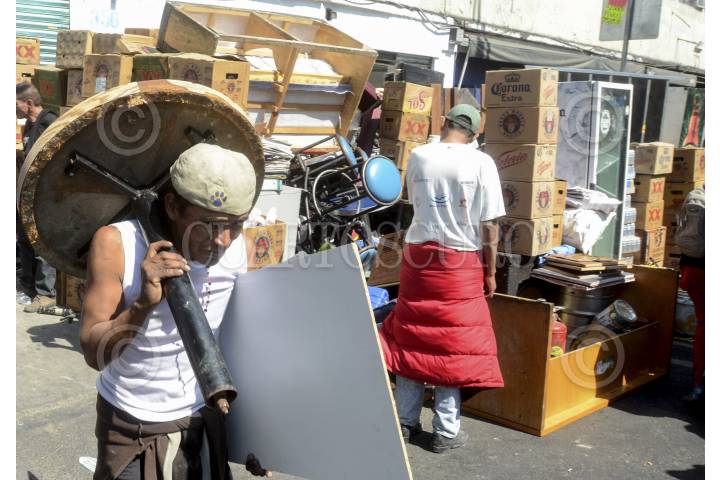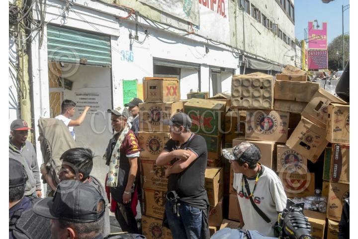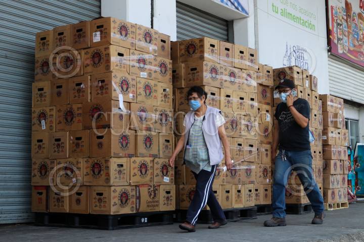 Dos personas transitan por cajas de cerveza en la Central de Abastos