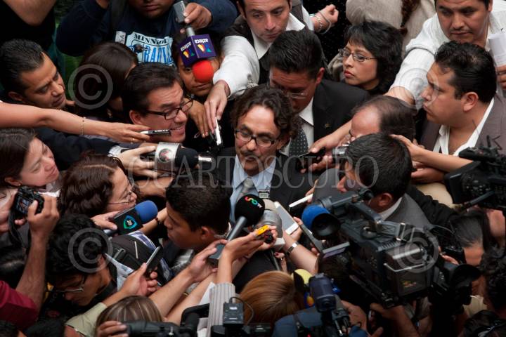 MÉXICO, D.F. 22MAYO2012.- Gabriel Quadri De La Torre, candidato de Nueva Alianza, es interceptado por reporteros al finalizar su participación en la "Primera Cumbre Ciudadana para la Construcción de un México Pacífico y Justo". Esta situación también es conocida en el argot periodístico como "chacaleo". FOTO: JUAN PABLO ZAMORA /CUARTOSCURO.COM