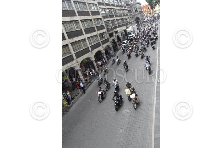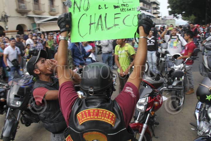 CUERNAVACA, MORELOS, 13AGOSTO2014.- Motociclistas salieron a manifestarse esta tarde en contra del nuevo reglamento de tránsito y el uso obligatorio del chaleco oficial. Los manifestantes bloqueando por algunas horas las calles del primer cuadro de la ciudad portando pancartas en contra del gobernador Graco Ramírez. FOTO: PATRICIA MORALES /CUARTOSCURO.COM