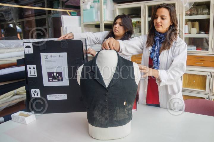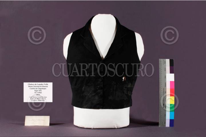 MEXICO, D.F., 07ABRIL2015.- Un chaleco confeccionado con telas de algodón, lana y seda que presenta varios orificios ocasionados por impacto de bala, y que forma parte del acervo de indumentaria del Museo Nacional de Historia (MNH), Castillo de Chapultepec, fue restaurado por especialistas del Instituto Nacional de Antropología e Historia (INAH). La prenda perteneció al general liberal Leandro Valle Martínez, quien fue fusilado el 26 de junio de 1861. FOTO: INAH/CUARTOSCURO.COM
