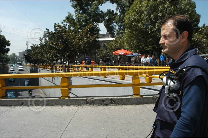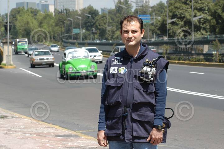 MEXDF 13JULIO2004.- La Secretaria de Salud, comenzo un programa de monitoreo de la contaminación. Un chaleco con diversos dispositivos de medición de las particulas contaminantes que hay en el medio ambiente seran usados por un grupo de adultos mayores. Roman Rodriguez es un usuario que realizo un recorrido por avenida Reforma. FOTO: Germán Romero/CUARTOSCURO.COM