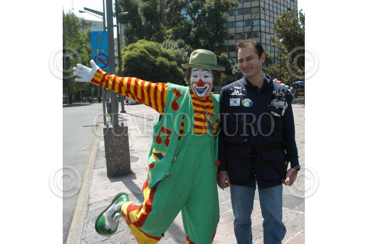 MEXDF 13JULIO2004.- La Secretaria de Salud, comenzo un programa de monitoreo de la contaminación. Un chaleco con diversos dispositivos de medición de las particulas contaminantes que hay en el medio ambiente seran usados por un grupo de adultos mayores. El payaso¨jaboncito Dicaprio¨ acompaña a Roman Rodriguez es un usuario del chaleco. FOTO: Germán Romero/CUARTOSCURO.COM