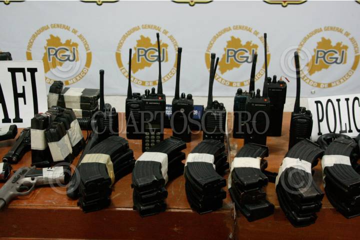 TOLUCA. EDO. DE MÉXICO, 30ABRIL2009.- Detenida peligrosa Banda delictiva denominada "Banda del Toro" que operaba en el Valle de Toluca, Jorge Pérez Farfán, de 28 años, alías “El Toro”, presunto líder de esta organización delictiva, originario de Zitácuaro Michoacán, el cual se encontraba a bordo de una camioneta Windstar color blanca, a quien se le aseguró en sus manos un paquete de cocaína, Michel Paniagua Tolteca, de 28 años, esposa de Pérez Farfán, Neftali Paniagua Tolteca, de 32 años, alías “el flaco”, hermano de Michel, cuya actividad dentro de la organización, era alimentar a las víctimas que se encontraban privadas de su libertad, Prisciliano Sánchez Sánchez, de 43 años, alias “el Prisi”, sujeto que se dedicaba a la compra y venta de droga. Elementos de seguridad exploraron una casa de seguridad asegurando dentro del inmueble: 13 armas largas, 4 armas cortas, 18 cargadores para fusil AK47, 155 cartuchos calibre, 38 super, 11 chalecos antibalas con la leyenda AFI, Ropa de comando de color verde militar, etc. FOTO: CUARTOSCURO.COM