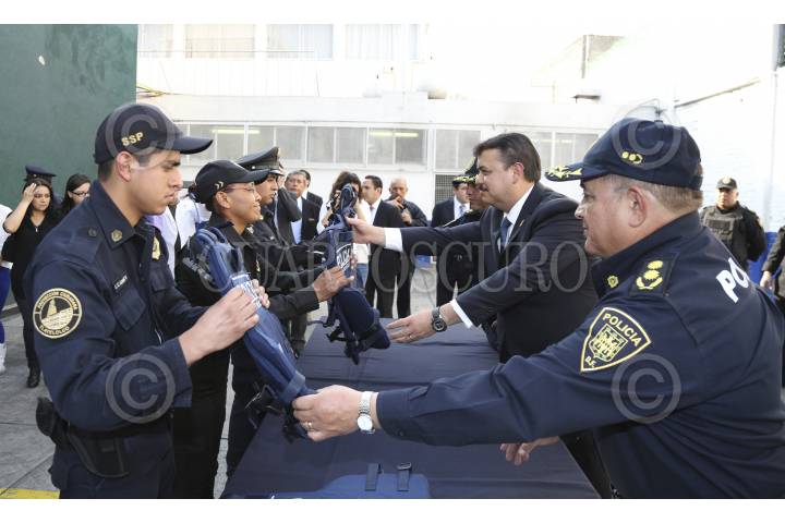 MÉXICO, D.F., 19DICIEMBRE2014.- El titular de la Secretaría de Seguridad Pública del Distrito Federal (SSP-DF), licenciado Hiram Almeida Estrada entregó más de cinco mil nuevos chalecos antibalas al personal de la institución, en sustitución de las prendas que, por su antigüedad, ya no resultan adecuadas para las funciones de los elementos. Dentro de las instalaciones de la Policía Metropolitana (Granaderos Poniente), el funcionario indicó que es indispensable otorgar al personal operativo de la institución las condiciones apropiadas para que desempeñen mejor su trabajo. En este caso -afirmó-- "los chalecos son los que principalmente van a salvaguardar su vida y fundamentarán el valor con el que desarrollen cualquier actividad, aun cuando estén en condiciones de riesgo". FOTO: SAÚL LÓPEZ /CUARTOSCURO.COM