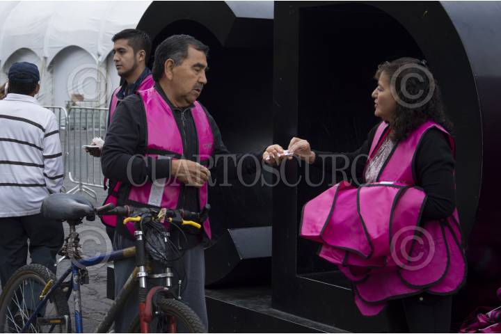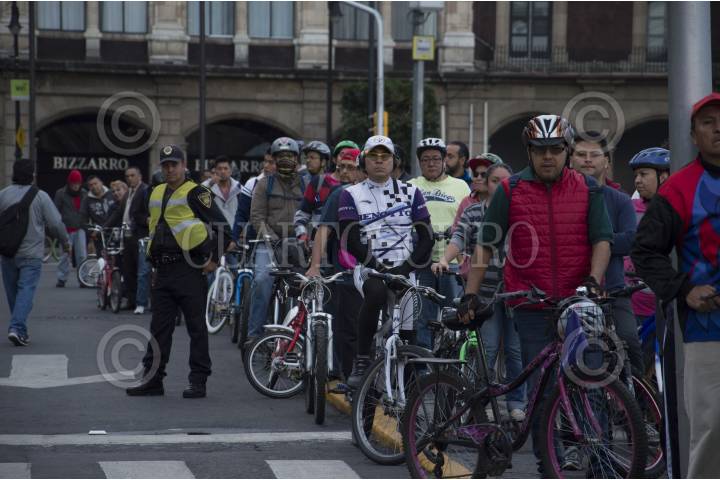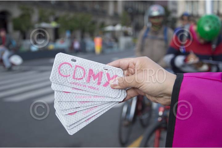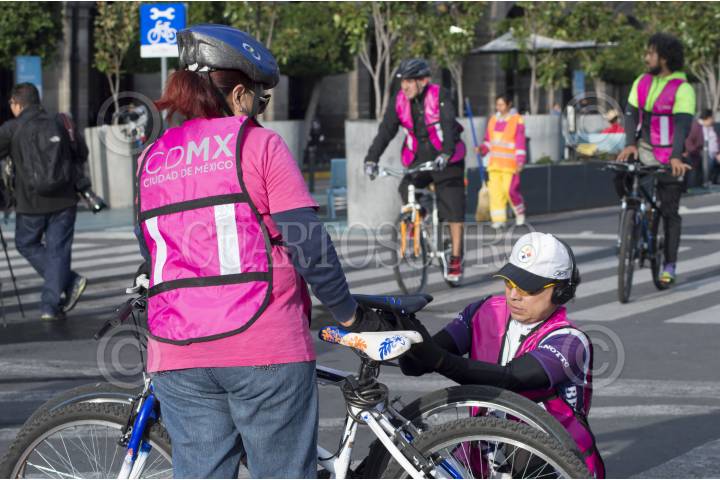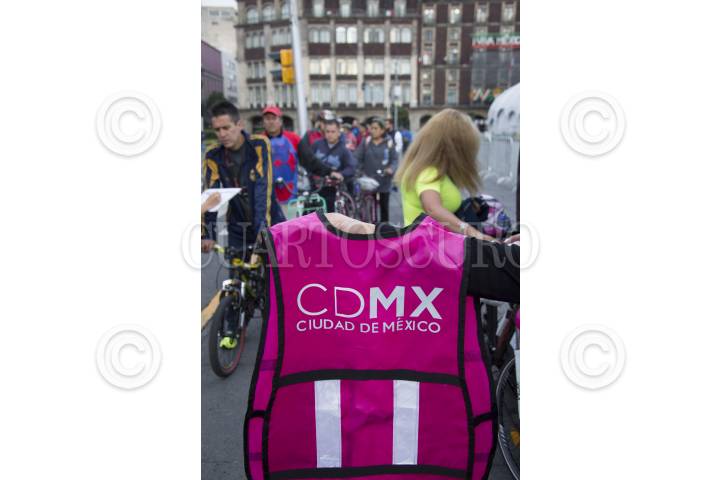 CIUDAD DE MÉXICO, 22SEPTIEMBRE2016.- Integrantes de la Secretaría del Medio Ambiente (SEDEMA) regalaron chalecos y placas reflejantes a los ciclistas del Zócalo capitalino, esto durante el Día Mundial Sin Automóvil. FOTO: GALO CAÑAS /CUARTOSCURO.COM