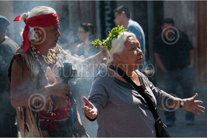 MÉXICO, D.F., 6ABRIL2008.- Capitalinos hacen fila frente catedral para resivir una limpia de los chamanes aztecas que por unas monedas quitan las malas vibras FOTO: RICARDO CASTELAN /CUARTOSCURO.COM,