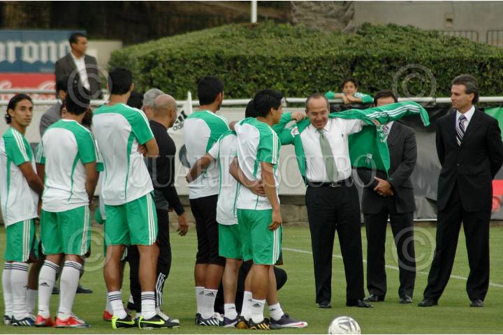 MÉXICO, D.F., 03JUNIO2009.- El presidente Felipe Calderón se coloca una chamarra oficial de la selección nacional durante el entrenamiento de la Selección Mexicana de Futbol que se realizo en el Centro de Alto Rendimiento. FOTO: RODOLFO ANGULO/CUARTOSCURO.COM