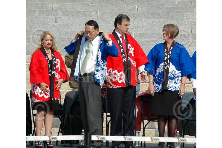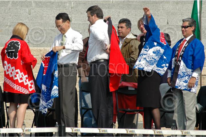 MÉXICO, D.F., 21NOVIEMBRE2009.- El embajador de Japón en México Masaaki Ono, el jefe de gobierno Marcelo Ebrard, Elena Cepeda, secretaria de Cultura y Alejandro Rojas, secretario de Turismo se colocan un chamarra con símbolos japoneses durante un desfile por motivo de la Feria México - Japón 400 años que se realizo en el Paseo de la Reforma. FOTO: RODOLFO ANGULO/CUARTOSCURO.COM