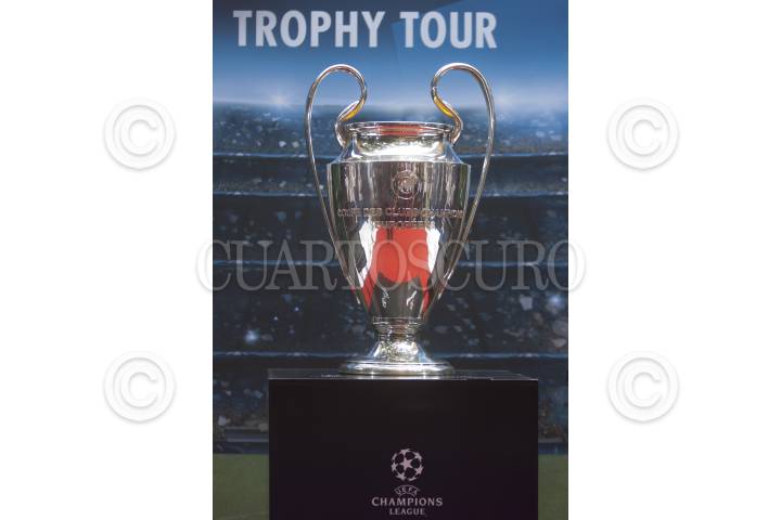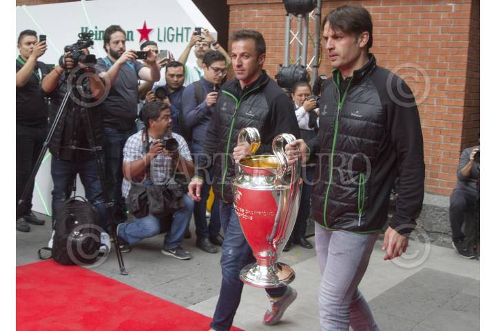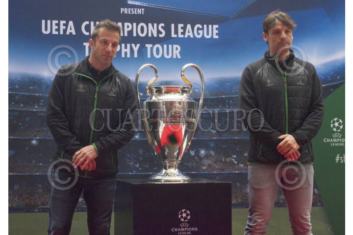 MONTERREY, NUEVO LEÓN, 08MARZO2017.- Los ex-futbolistas, el Italiano Alessandro Del Piero y el Español Fernando Morientes posan junto al Trofeo de la UEFA Champions League, en su gira por México. FOTO: CUARTOSCURO.COM