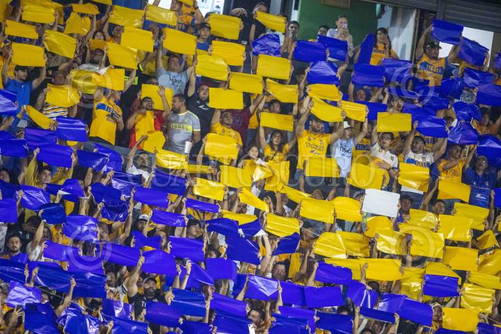 Aficionados de Tigres, apoyan a su equipo en la ida de las semifinales del Torneo Concacaf Champions League 2023, ante León, en el estadio Universitario.