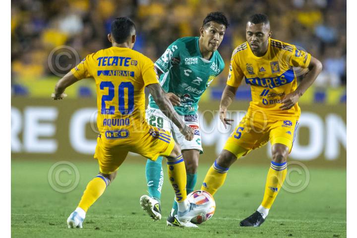 Javier Aquino y Rafael Carioca de Tigres, se disputan el balón con Lucas Romero de León, en el estadio Universitario, partido correspondiente a la ida de las semifinal del Torneo Concacaf Champions League 2023..