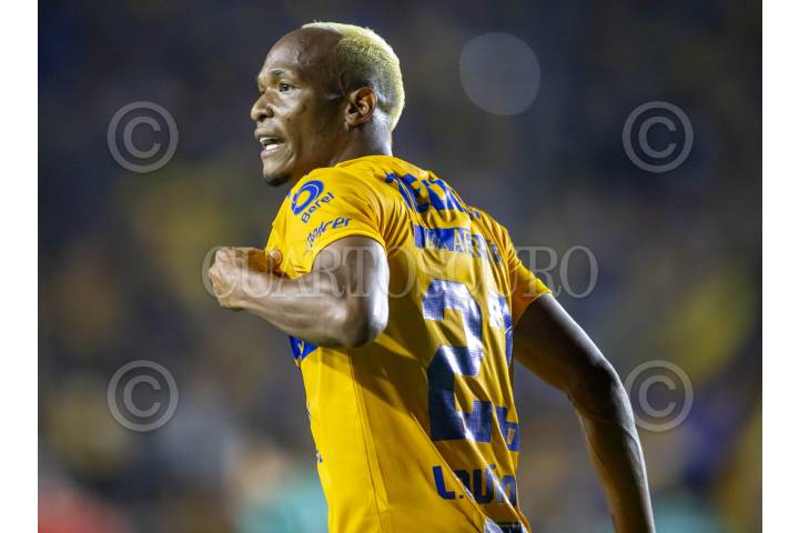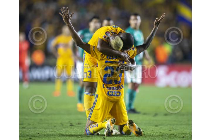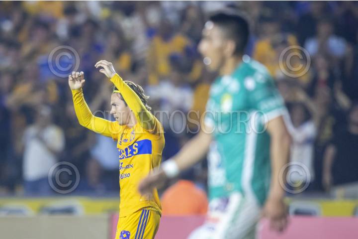 Luis Quiñones de Tigres, celebra el gol, ante León, en el estadio Universitario, partido correspondiente a la ida de las semifinal del Torneo Concacaf Champions League 2023.