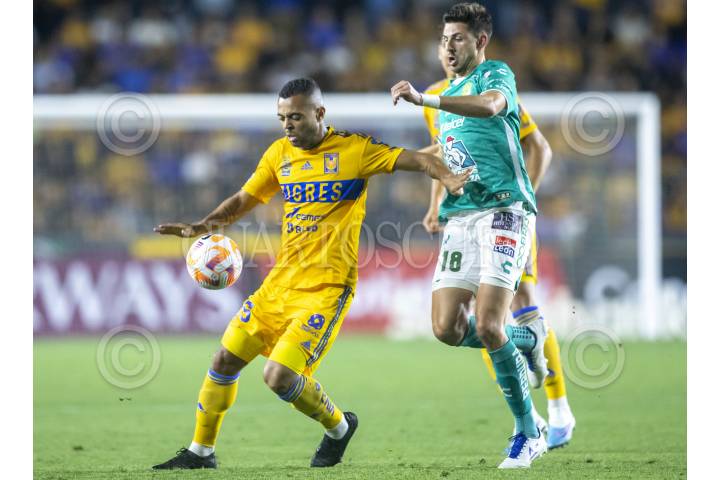 Rafael Carioca de Tigres, se disputan el balón con Lucas Di Yorio de León, en el estadio Universitario, partido correspondiente a la ida de las semifinal del Torneo Concacaf Champions League 2023.